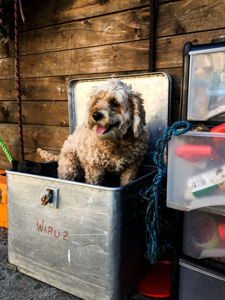 Being in the presence of perhaps the most over-enthusiastic, yappy and persistently naughty little dog in the entire history of canines probably doesn’t sound like therapy. But for me, it is. Betty never fails to make me smile with her antics, her irrepressible enthusiasm for ball games, her wonky gait and her silly mannerisms. For example, if you found Betty unravelling your mother’s knitting, yarn tangled round every one of her limbs as well as every chair-leg in the room, I guarantee you would laugh, too. This morning, she had inserted herself in a box designed to hold horse equipment outside the stables. It was purely a bid for attention, and to her credit, her efforts were sufficiently amusing to gain the audience she desired.